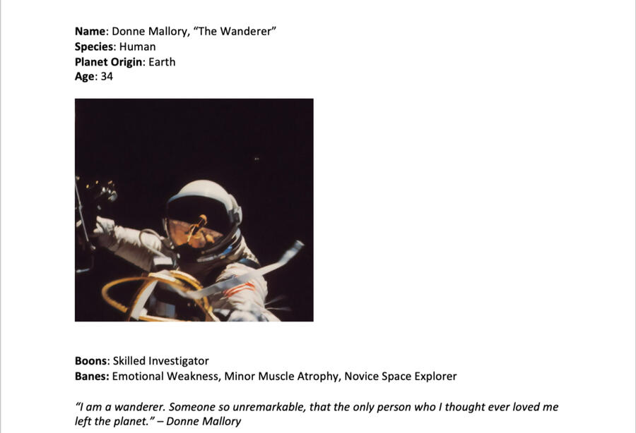 1-page character bios for original characters. Includes objective facts, traits, background, and current situation.