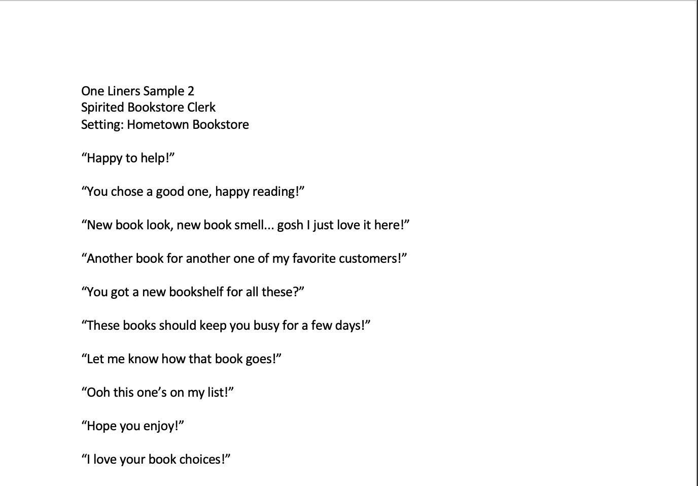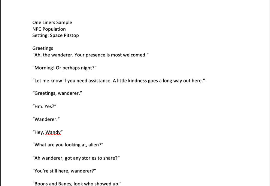 1-page samples of one liners for NPCs. Includes variations for greetings and exchanges for populated worlds.