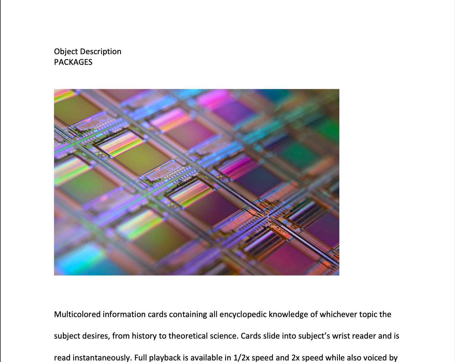 Half-page prose paragraphs for descriptions of objects within a world.